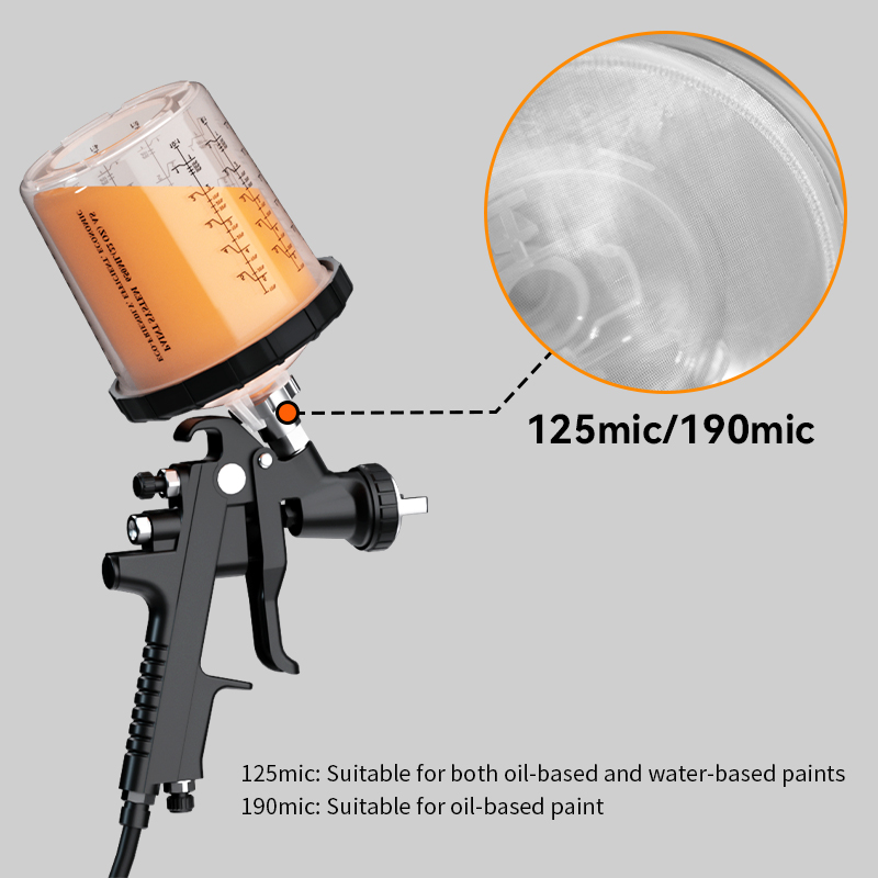 • Built-in integrated filters for superior paint finish: The disposable spray cup cap features built-in 190μ (oil-based paint) and 125μ (water-based paint) filters, effectively filtering impurities during spraying and increasing paint gloss by 20%.