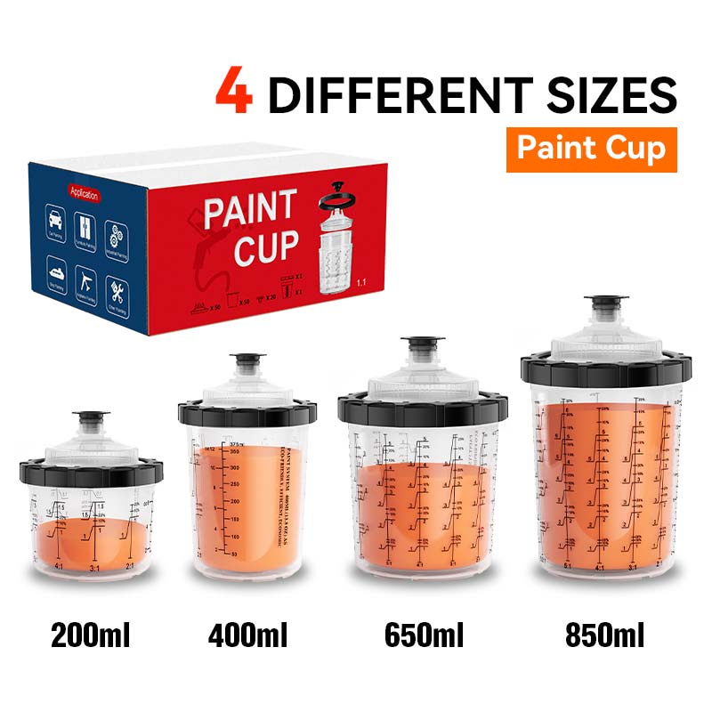 Based on market research, the paint cup is available in four capacity specifications: 200ml, 400ml, 650ml, and 850ml, catering to different usage scenarios, whether for large-area spraying or detailed touch-ups. Additionally, the inner cup structure has been optimized to ensure smooth paint flow, reducing clogging and waste.